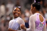 Biles is en route to claiming a record seventh national all-around title - breaking her tie with gymnast Clara Schroth-Lomady, who also holds six national all-around titles on the women's side - and we're glad she has this good-luck charm to keep her company. (Not that she needs it one bit.) Ahead, check out a few photos of this goat leotard at 2021 Nationals. It's record-setting, gold-medal energy, and our vote for the official Simone Biles goat mascot is . . . drumroll please . . . Goldie, Goldie the goat. Thank you, and goodnight!